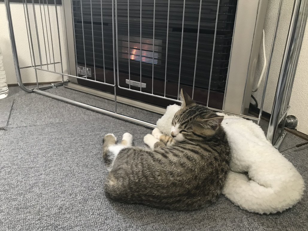 ストーブの前が大好きすぎて、ミーガちゃんも焦げちゃいそうですし、お気に入りのケージ ?ベッド?もストーブに押しつけて焦がしかけまして、いよいよ会社が燃えたら困るので先日ストーブガードを設置したわけです。
