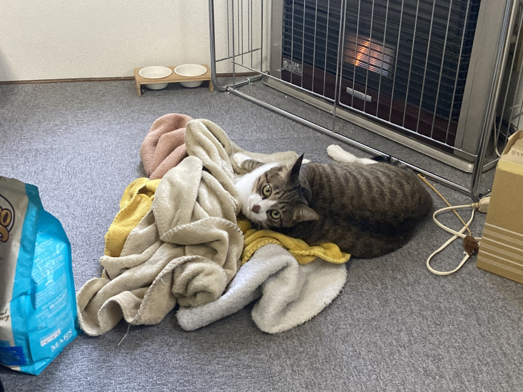 といいつつまだ寒いときもあり、定位置でブランケットと一緒。